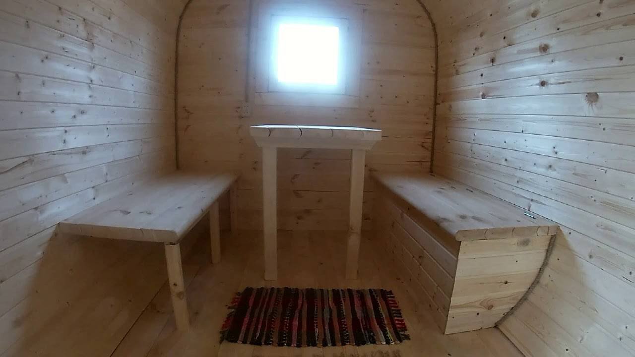 1. Вход по середине бани, это удобней, позволяет сделать столик не на проходе, можно баню расположить параллельно тропинке входа (например поставить вдоль забора). 2. Выносная топка – расположена у входа в баню. Можно топить баню не входя внутрь бани, тем самым не пачкать. В круглой бане, чтобы добраться до печки придется пройти вдоль всей бани, и подкидывать в самой парной что не удобно, теряется тепло в парной – особенно это важно в зимний период. Экономия на уборке самой бани существенная так как не пачкается при подготовке к использованию. 3. Дверка топки со стеклом – топка расположена на против лавок и столика, приятно смотреть на огонь через стекло, людям очень нравится, уверен и ваши гости оценят (эффект камина)! Плюс удобно контролировать само горение, и не заглядывать каждый раз, чтоб посмотреть нужно подкидывать дров или нет… 4. Планировка в парной – так как печь смещена к стенке, и из-за выносной топки в самой парной остается больше свободного места, и полки располагаются в два яруса по высоте. Это намного удобней, чем в классической круглой бане. 5. Осиновая парная – всю парную делаем из осины (стены, потолок, пол, лавочки и т.д.), это обеспечивает более комфортные условия, так как осина не выделяет смолу и можно спокойно присаживаться на лавку не боясь обжечься, а самое главное практически не возможно получить занозу, так как осина очень мягкий материал. 6. Утепленные бани – быстрей прогревается (летом 20-30мин., зимой при -20С – 40-50мин.) и дольше сохраняется тепло, для бань при использовании в коммерческих целях это имеет большое значение, кроме экономии на дровах, экономится рабочее время сотрудников которые обслуживают баню. Ну или посетителям нужно меньше тратить время если они сами топят. 7. Окна в комнате отдыха – окно 60х60см (экологичный энергосберегающий стеклопакет ) расположено прямо на против столика, очень приятно сидеть пить чай и смотреть в окно или на горящий огонь в печке. Особенно хорошо когда у вас прекрасные пейзажи в округе. 8. Прочность бани – дополнительное утепление и внутренняя отделка добавляет жёсткость конструкции, исключает щели в стенах (что часто бывает в летнем варианте). Увеличивает срок службы бани. 9. Дизайн – при утеплении внутренняя отделка смотрится гораздо привлекательней, и даёт возможность в дальнейшем проводить косметические ремонты (заменить вагонку и т.д.)