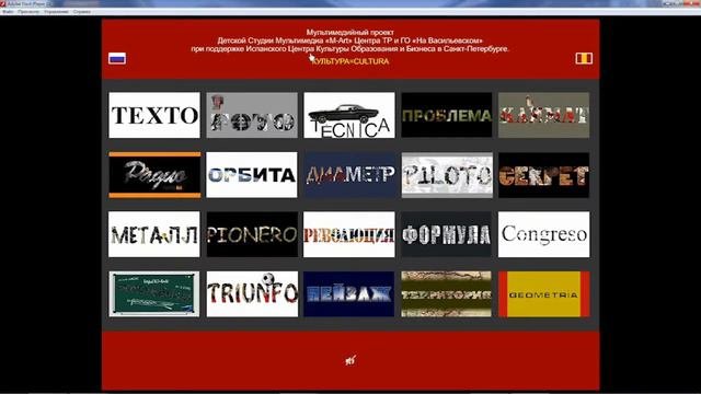 Проект «Слово-Смысл. Культура=Cultura» Русский и испанский языки содержат значительное количество слов, имеющих общее звучание и смыл. Общие слова в двух сравниваемых языках могут быть почти тождественными по звуковой форме или же быть схожими графически, однако, отличаться по месту ударения в слове и по звучанию отдельных гласных или согласных звуков. Наличие общих слов вызвано определенными историческими причинами — общим происхождением некоторых слов, бытовым и культурным общением народов, говорящих на разных языках. Многие европейские языки, при обозначении новых понятий, возникающих в связи с развитием государства и появлением новых общественных отношений, историческим развитием науки и техники, широко использовали слова, заимствованные из греческого и латинского языков. В русском и испанском языках смыл слов, может быть идентичен, но понимание этого смысла различаться в зависимости от менталитета. Например, слово пионер в русском понимании — это пионерская политическая молодёжная организация. В испанском — это первооткрыватель — Христофор Колумб. Но есть слова, понимание смысла которых тождественны — Kультура=Cultura. Задача этого проекта, при помощи анимации русского и испанского слова выявить отличие, либо тождественность понимания их смыла. Презентация образовательного мультимедийного проекта «Слово-Смысл. КУЛЬТУРА=CULTURA» состоялась в апреле 2012 года в Испанском Центре Культуры Образования и Бизнеса в Санкт-Петербурге. Авторы-учащиеся студии: Полина Жукова, Юлия Железняк, Иван Новожилов, Ксения Костюченко, Леонид Слокотович, Людмила Лямина, Полина Харламова, Николь Полушкина, Павел Баташёв, Мария Семёнова, Дарья Катурёва, Алина Коротовская, Артём Арутюнян, Ирина Анахина, Денис Тарасов, Кирилл Устинов, Иван Невзоров, Анастасия Киселёва, Денис Ярославцев, Павел Булгаков, Ксения Масленицкая, Герман Цветков, Артём Иванов, Светлана Палкина Идея, контент, дизайн, координатор проекта: Ольга Костюченко Программирование: Анастасия Скульская Преподаватели: Анастасия Скульская, Ольга Костюченко