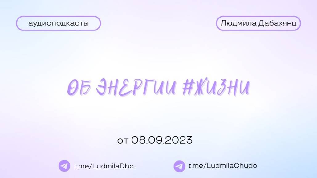 Аудиоподкаст от 08.09.23 На тему «Об энергии #ЖИЗНИ» ТЫ МОЖЕШЬ ПРИЙТИ СО СВОИМ ЗАПРОСОМ! ✓ Обязательно поставь лайк ✓ Подпишись на канал ✓ И поделись с близкими Это будет вашим балансом за движение и получение энергии. Если есть желание создать баланс брать-давать... приму от всего сердца с благословением (донейшн). С Огромной Любовью, Дабахянц Людмила ✨ Telegram: https://t.me/ludmiladbc ✨ Канал в telegram “Я ЕСТЬ ТО, ЧТО Я ЕСТЬ”: https://t.me/LudmilaChudo ✨Онлайн-школа: https://ludmilachudo.skillspace.ru/school