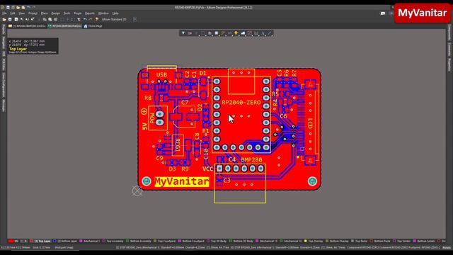 Temperature, Air Pressure, and Altitude on a GUI using Raspberry Pi Pico, Bosch BMP280, and LVGL ====================================== Article: https://www.eeweb.com/temperature-air-pressure-and-altitude-on-a-gui-using-raspberry-pi-pico-bosch-bmp280-and-lvgl/ ====================================== Altium Designer + Legal License (Free): https://www.altium.com/yt/myvanitar ====================================== Altium 365: https://www.altium.com/altium-365 ====================================== OctoPart: https://octopart.com ====================================== Other Videos: http://bit.ly/2N9OlPa ====================================== Raspberry Pi Pico is a handy piece of hardware. It’s small, cheap, and equipped with a powerful dual-core RP2040 microcontroller that offers 2M (up to 16M) Flash and 264K SRAM memories. Such specifications make it a good choice for GUI-based (graphical user interface) hobby and industrial projects. In this article/video, I used a variant of the Pico board (RP2040 Zero), a digital Bosch I2C BMP280 sensor, and a 3.2” SPI ILI9341 colorful TFT display to build a graphical temperature, pressure, and altitude measurement unit that can be used to monitor the home, workplace, mobile devices, vehicles … etc. The most challenging part of this project is the RP2040 code. I used the Pico C/C++ SDK library and invested significant time in designing the GUI and debugging the code to avoid memory leaks. I engaged both cores of the MCU to run the time-constraint tasks simultaneously. To design the schematic and PCB, I used Altium Designer 24 and the Octopart website to quickly gather the necessary component information and generate the BOM. You can power the unit using a USB Type-C cable of a mobile charger or your 5V-regulated power source.