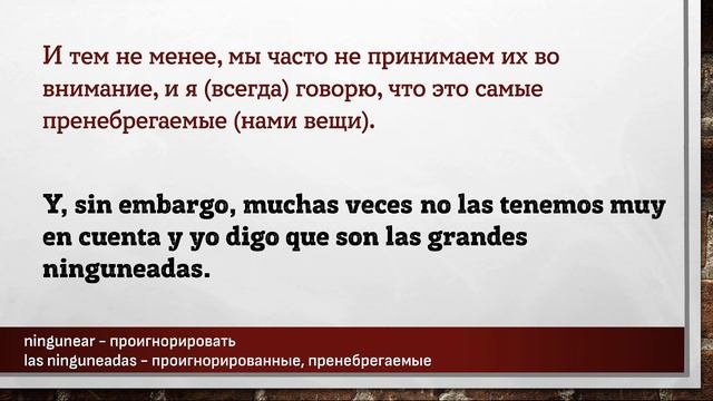 Данный материал предназначен исключительно в образовательных целях. Данный материал частично был синтезирован с помощью искусственного интелекта. Цель – заставить мышление учащегося формировать фразы, части фраз, на испанском языке. Каждая фраза повторяется три раза. Повторения происходит не подряд, а с некоторым "смещением", заставляя всё время мысленно переключаться на другую фразу. Пауза между фразами служит для того, чтобы вспомнить хотя бы одно слово, часть фразы или всю фразу на испанском языке. Чем длиннее фраза на русском языке – тем длиннее пауза до фразы на испанском языке. Достаточно, если человек самостоятельно начинает формировать хотя бы кусочки фразы, некоторые слова. Данный вид упражнений не стоит делать более одного часа за один раз. Достаточно прослушивать такие упражнения в фоновом режиме: замимаясь домашними делами, находясь в дороге или на прогулке, занимаясь спортом. Чтобы выучить любой язык необходимо «провести с ним» 10 000 часов. Урок основан на эпизоде подкаста взятом на сайте https://www.bbvaaprendemosjuntos.com/es Полная ссылка на эпизод подкаста: https://www.youtube.com/watch?v=L_nI8GANcyA #испанский #испания #слова #фразы #aprender #español #españa #español #испанскийязык #испанскийбесплатно #испанскийэффективно #учимиспанский #испанскийучить #shadowing #ShadowingTechnique #Lerntechnik #произношение #грамматика #subjuntiv #expresiones #shadowingmethode #эффективно #españolonline #españoloffline #aprenderespanolonline #pimsleur #paulpimsleur Слова и выражения из этой части подкаста: ================================================ abandonado - заброшенный, забытый, покинутый acompañar - сопровождать, поддерживать, находиться рядом, сочувствовать atravesar - пересечь, пройти через, переживать el apuro - неприятность, беда, затруднительное положение el consejo preparado - совет на готове, подготовленный совет el descanso - отдых, перерыв el sufrimiento - боль, страдания, мучения es algo grande - нечто большое, нечто серьёзное es importantísimo que + (subj.) - крайне важно, чтобы... la adversidad - несчастье, напасть, бедствие la conciencia - осознание, понимание la virtud - достоинство, способность, сильная сторона личности las ninguneadas - проигнорированные, пренебрегаемые ningunear - проигнорировать nuestro mundo interior - наш внутренний мир puramente - исключительно, сугубо saciar - утолять, удовлетворять, насыщать ser capaces de - уметь нечто, обладать способностью сделать нечто ser honrado - быть уважаемым, быть почитаемым todas las demás - все остальные, все другие trascender - выходить за рамки, распространяться tratar - относиться, обходиться, заботиться