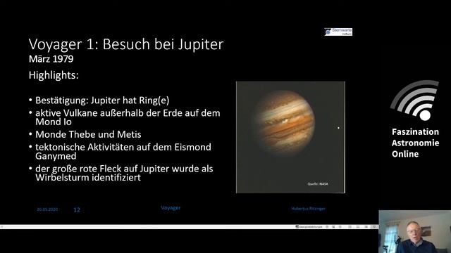 Faszination Astronomie Online bietet euch immer dienstags und donnerstags an dieser Stelle um 19 Uhr eine halbe Stunde Astronomie. 1977 wurden die beiden Raumsonden Voyager 1 und 2 gestartet. Ihr Ziel: die Außenbereiche unseres Sonnensystems. Sie besuchten die Gasplaneten Jupiter, Saturn, Uranus und Neptun mit ihren Monden und erkunden mittlerweile den interstellaren Raum. Hubertus Ritzinger von der Sternwarte Hofheim nimmt uns mit auf die Reise in die Weiten des Alls.