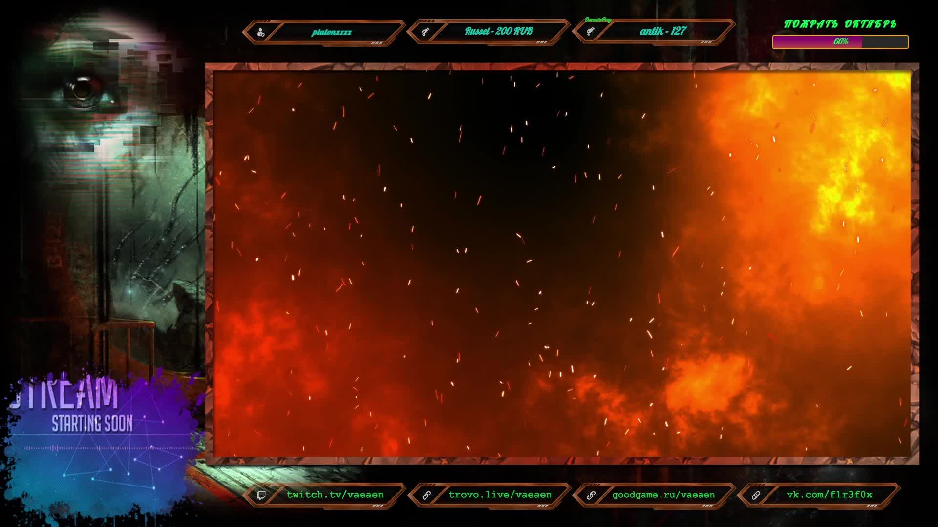 Если хотите поддержать меня как стримера - нажмите по данной ссылке https://www.donationalerts.com/r/f1r3f0x Donate for USD, EU all world - https://new.donatepay.ru/@vaeaen Во время стрима ваше сообщение появится на экране, и будет сопровождаться голосовым диктором. Поддержка на Boosty https://boosty.to/vaeaen Поддержка без комиссии: Сбер: 2202 2010 0629 1039 Тинькофф: 2200 7008 4677 0625 Основные каналы: Twitch: https://www.twitch.tv/vaeaen Trovo: https://trovo.live/Vaeaen GoodGame: https://goodgame.ru/channel/Vaeaen/ VKplay: https://vkplay.live/vaeaen Wasd: https://wasd.tv/vaeaen YouTube: https://www.youtube.com/channel/UCsl3CyRcImUYtWiCgEdvmjQ