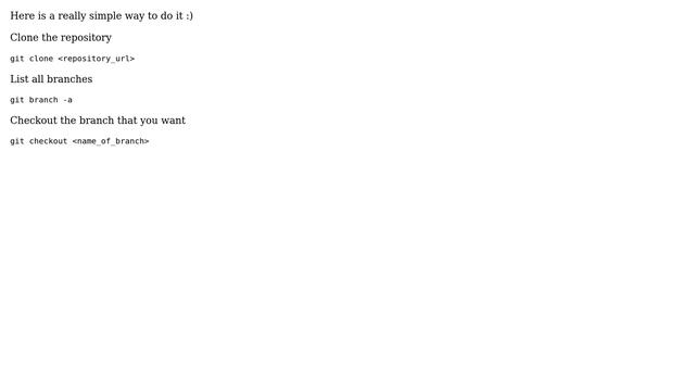 How do I clone a specific Git branch? Helpful? Please use the *Thanks* button above! Or, thank me via Patreon: https://www.patreon.com/roelvandepaar! With thanks & praise to God, and with thanks to the many people who have made this project possible! | Content (except music & images) licensed under CC BY-SA https://meta.stackexchange.com/help/licensing | Music: https://www.bensound.com/licensing | Images: https://stocksnap.io/license & others | With thanks to user superlogical (stackoverflow.com/users/52360), user Scud (stackoverflow.com/users/207419), user savgur (stackoverflow.com/users/932479), user PlanetUnknown (stackoverflow.com/users/179521), user Michael Krelin - hacker (stackoverflow.com/users/95382), user Jorge E. Cardona (stackoverflow.com/users/361023), user Edmar Miyake (stackoverflow.com/users/189410), user dkinzer (stackoverflow.com/users/256854), and the Stack Exchange Network (stackoverflow.com/questions/1911109). Trademarks are property of their respective owners. Disclaimer: All information is provided "AS IS" without warranty of any kind. You are responsible for your own actions. Please contact me if anything is amiss at Roel D.OT VandePaar A.T gmail.com
