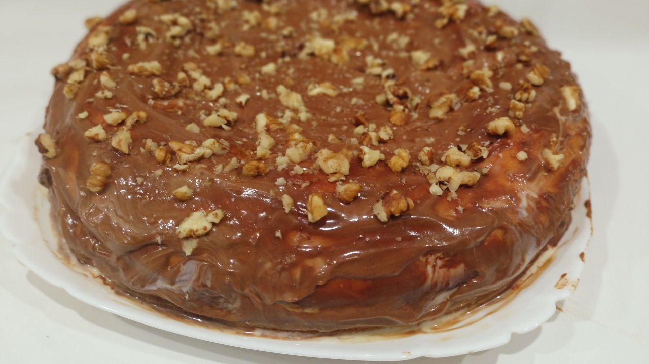 Торт "Мишутка" Тесто: 1 банка сгущёнки-350 гр. 300 гр. сметаны, 1 ч.л. соды, 3 яйца, 2 стол.л. какао. 300 гр. муки. 1.Сгущёнка+яйца,сметана,хорошо взбить+сода и мука.Разделить на 2 равных части.В одну добавить какао. 2.Испечь 2 коржа,остудить.Аккуратно ножом разрезать на 2 части. Крем: 150 гр. слив. масла или сметаны 0,5 банки сгущёнки(вар. можно обычной) Хорошо взбить. 3.Коржи пропитать,смазать кремом.Сложить тортик,края тоже смазать кремом. Глазурь: 2 стол.л. какао, 1 стол.л. сметаны, 1 ст л сахара (по желанию). Всё соединить,довести до кипения,слегка остудить. 4.Торт смазать глазурью,посыпать орешками. 5.Поставить в х-к,пропитаться.