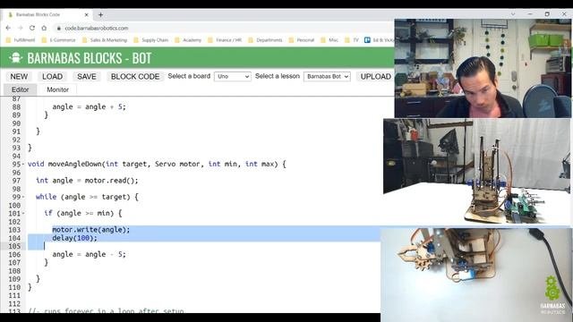 I show you how to incorporate the max and minimum angles into your move functions so that your code never pushes your robot arm beyond its limits. Topics Covered: - Pass through parameters Challenges: Challenge #1: Wire and test claw motor Challenge #2: Find min and max angles for all motors and create the macros Challenge #3: Run through all the motors using the min/max values Challenge #4: Code the robot to pick up a marker Sample code: https://github.com/BarnabasRobotics/robot-arm/blob/main/E6_all_motors_with_limits_in_function.ino Resources: - Coding site: https://code.barnabasrobotics.com - Need a kit? https://shop.barnabasrobotics.com/products/barnabas-arduino-compatible-robot-arm-kit-with-joystick-control-ages-11