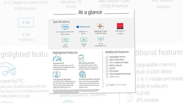 HP 22 All-in-One PC, AMD Athlon Gold 3150U Processor, 4 GB RAM, 256 GB SSD, Full HD