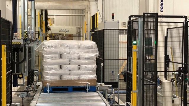 Упаковка мешков в стретч-плёнку на паллете. Паллетообмотчик Robopac с вращающейся рукой.