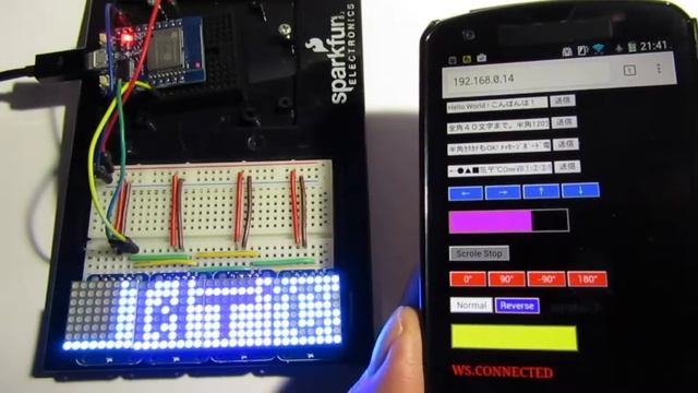スマホでWi-FiリアルタイムWebSocket 制御の電光掲示板を作ってみました。今回は4連ドットマトリックスです。 美咲フォント使ってます。 しかも、部品点数が極端に少ないのが良いです。 作り方も簡単です。 詳しくはブログへ https://www.mgo-tec.com/blog-entry-wroom-websocket-messageboard-04.html [tool} *ESP-WROOM-02 ( ESP8266 )開発ボード(Switch-Science) *I2C 8x8 mini LED matrix (Adafruit) *Android, Google Chrome
