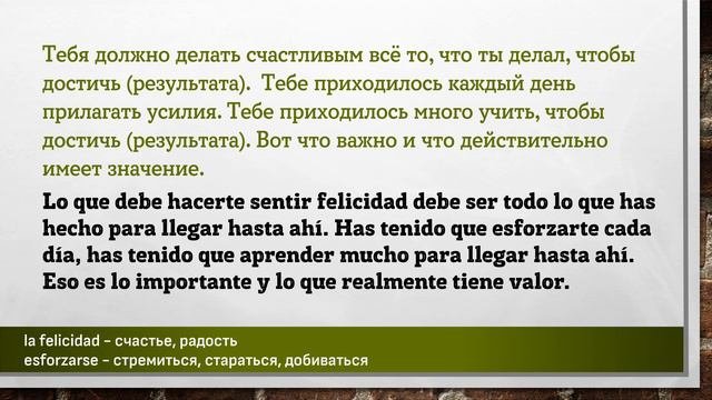 Урок основан на эпизоде подкаста взятом на сайте https://www.spanishpodcast.net Полная ссылка на эпизод подкаста с транскрипцией: https://www.spanishpodcast.net/learn-spanish-minimo-maximo/ Полная ссылка на аудио файл эпизода: https://ia601702.us.archive.org/7/items/zminfjffwspespespmaxsksiee3349sla33ffj442espsp/zminfjffwspespespmaxsksiee3349sla33ffj442espsp.mp3?_=1 Уроки начинающиеся на "№#s*****" имеют уровень сложности B1-B2 и литературный испанский акцент. Данный материал предназначен исключительно в образовательных целях. Данный материал частично был синтезирован с помощью искусственного интелекта. Цель – заставить мышление учащегося формировать фразы, части фраз, на испанском языке. Каждая фраза повторяется три раза. Повторения происходит не подряд, а с некоторым "смещением", заставляя всё время мысленно переключаться на другую фразу. Пауза между фразами служит для того, чтобы вспомнить хотя бы одно слово, часть фразы или всю фразу на испанском языке. Чем длиннее фраза на русском языке – тем длиннее пауза до фразы на испанском языке. Достаточно, если человек самостоятельно начинает формировать хотя бы кусочки фразы, некоторые слова. Данный вид упражнений не стоит делать более одного часа за один раз. Достаточно прослушивать такие упражнения в фоновом режиме: замимаясь домашними делами, находясь в дороге или на прогулке, занимаясь спортом. Использйте для обучения только тот материал, который Вы понимаете на 90%-95%! Иностранные языки не учат. К иностранным языкам привыкают. Чтобы выучить любой язык необходимо «провести с ним» 10 000 часов. #испанский #испания #слова #фразы #aprender #español #españa #español #испанскийязык #испанскийбесплатно #испанскийэффективно #учимиспанский #испанскийучить #shadowing #ShadowingTechnique #Lerntechnik #произношение #грамматика #subjuntiv #expresiones #shadowingmethode #эффективно #españolonline #españoloffline #aprenderespanolonline #pimsleur #paulpimsleur Слова и выражения из этой части подкаста: ================================================ afectar - влиять, затрагивать, отражаться afrontar - противостоять, сталкиваться aprobar un examen - сдавать экзамен aprovechar - воспользоваться, использовать avanzar - двигаться вперёд, продвигаться conseguir - добиваться, получать conseguir un certificado - получать диплом, сертификат consolidar - укреплять, объединять, сплочать de forma constante - на постоянной основе, непрерывно dominar - осваивать, овладевать, господствовать el aprendizaje - обучение, учёба el artista surrealista - художник-сюрреалист el conocimiento - знание, понимание, познание el estado - состояние, положение el objetivo - цель, задача el valor - цена, стоимость, значение esforzarse - стремиться, стараться, добиваться establecer - устанавливать, создавать, основывать fugaz - мимолётный, скоротечный la clave - ключь, пароль, разгадка la constancia - постоянство, последовательность, упорство la excelencia - совершенство, самое высокое качество la felicidad - счастье, радость la leccion - урок, занятие la recompensa - вознаграждение, компенсация, награда limitarse - ограничиваться, довольствоваться recorrer - пройти, преодолеть una buena actitud - хорошее отношение, настроение