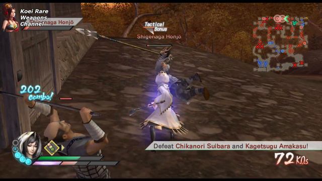 The final one of the conventional method, I now technically have all of them, I just need to re-do Takamaru's which is probably the hardest in the game by a mile. This is the same requirements as Masamune's. This is harder for the first objective as the Naginata can't reach massive Combo counts as easy, use a lightning element weapon to do this because the Ai Masamune and Magoichi will constantly attack Yasutsuna if you don't complete the objective straight away. Stage: Battle of Hasedo (Date Forces) - Free Mode Difficulty: Hard or Chaos Every Rare weapon in this game requires that you complete all 4 of the tactical bonuses in a stage Requirements (In order that I would recommend) 1. Defeat Yasutsuna Kamiizumi with a combo count of 500 or more 2. Defeat Shigenaga Honjo without your health ever going into the red 3. Defeat Yoshidide Shida while the Date army have 5 or more strongholds. 4. Defeat Aya within 12 min Note: This is the same method for Samurai Warriors 3Z the Japanese exclusive To Unlock this costume for edit characters (Wii Version only): Complete Kenshin and Kanetsugu's stories.