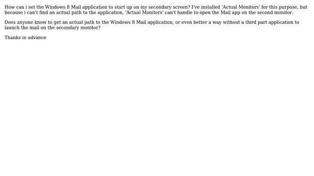 Windows 8 Mail on secondary monitor Helpful? Please support me on Patreon: https://www.patreon.com/roelvandepaar With thanks & praise to God, and with thanks to the many people who have made this project possible! | Content (except music & images) licensed under CC BY-SA https://meta.stackexchange.com/help/licensing | Music: https://www.bensound.com/licensing | Images: https://stocksnap.io/license & others | With thanks to user user1868569 (superuser.com/users/314003), user MorrowindFan (superuser.com/users/314060), and the Stack Exchange Network (superuser.com/questions/739229). Trademarks are property of their respective owners. Disclaimer: All information is provided "AS IS" without warranty of any kind. You are responsible for your own actions. Please contact me if anything is amiss at Roel D.OT VandePaar A.T gmail.com