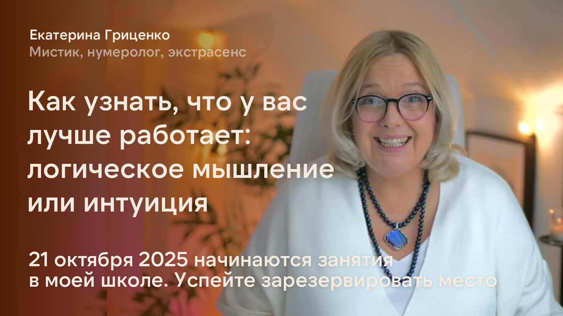 Через 5 дней - 21 октября начинаются занятия в моей школе (успейте зарезервировать место, если хотите у меня учиться). Среди прочего мы будем говорить о том, как по дате рождения вычислить особые способности человека. Вычислить и понять, как ими пользоваться. А сегодня давайте поговорим, чему можно доверять: логике или интуиции. Это вопрос становится невероятно актуален, когда логика говорит одно, а чувства – противоположное. Например, вы собираетесь замуж за хорошего и состоятельного человека и логика говорит, что он – отличная партия, а интуиция кричит: «Беги!!!». Чему верить? Поговорим об этом подробнее Ну и конечно, приходите ко мне учиться. Узнаете всё о ваших силах и способностях, поймёте, где можно действовать смело, а где - аккуратнее. Подробнее о Школе здесь: https://eviktorova.ru/school Смотреть лекцию "Как вырваться из оков судьбы" https://eviktorova.getcourse.ru/lectures_personality Внимание! Требуется регистрация #интуиция #ясновидение #логическоемышление #школанумерологии #екатеринавикторова #екатеринагриценко #школа_екатерины_гриценко
